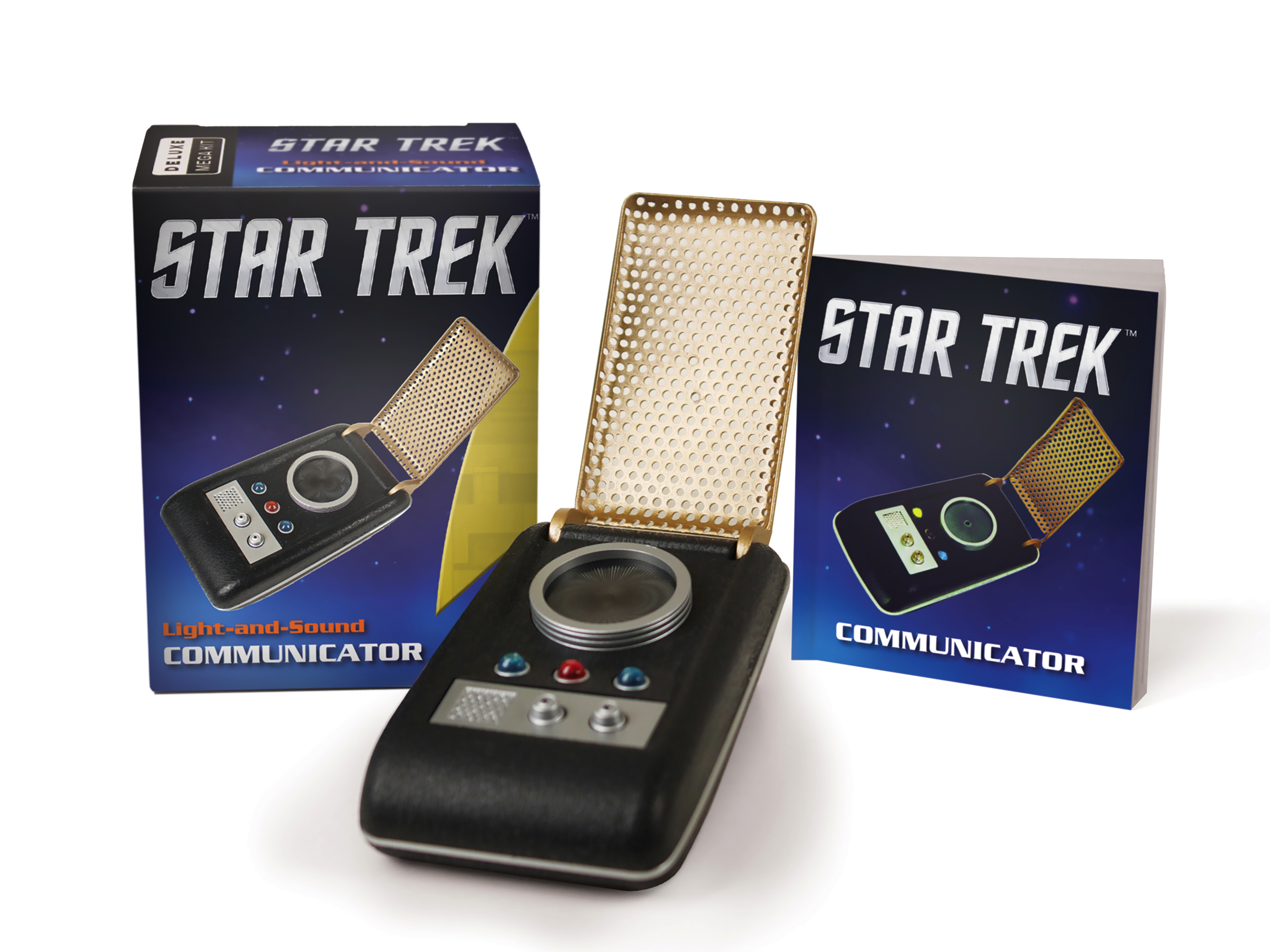 The communicator is used for voice communication and serves as an emergency-signaling device for Starfleet. Kit includes a replica of the iconic communicator, with light and sound, and a 48-page book on the history of communicators, complete with full-color photos.