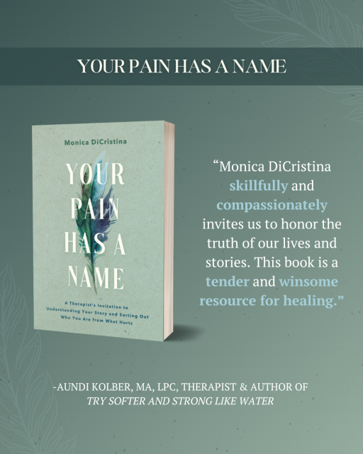"In Your Pain Has a Name, Monica DiCristina skillfully and compassionately invites us to honor the truths of our lives and stories. In doing so, she guides us toward one of the greatest paradoxes of all: Turning toward our pain helps us find a way through it. This book is a tender and winsome resource for healing."Aundi Kolber, MA, LPC, therapist and author of Try Softer and Strong Like Water